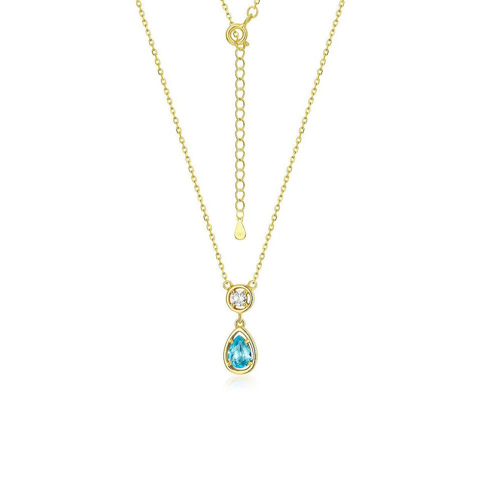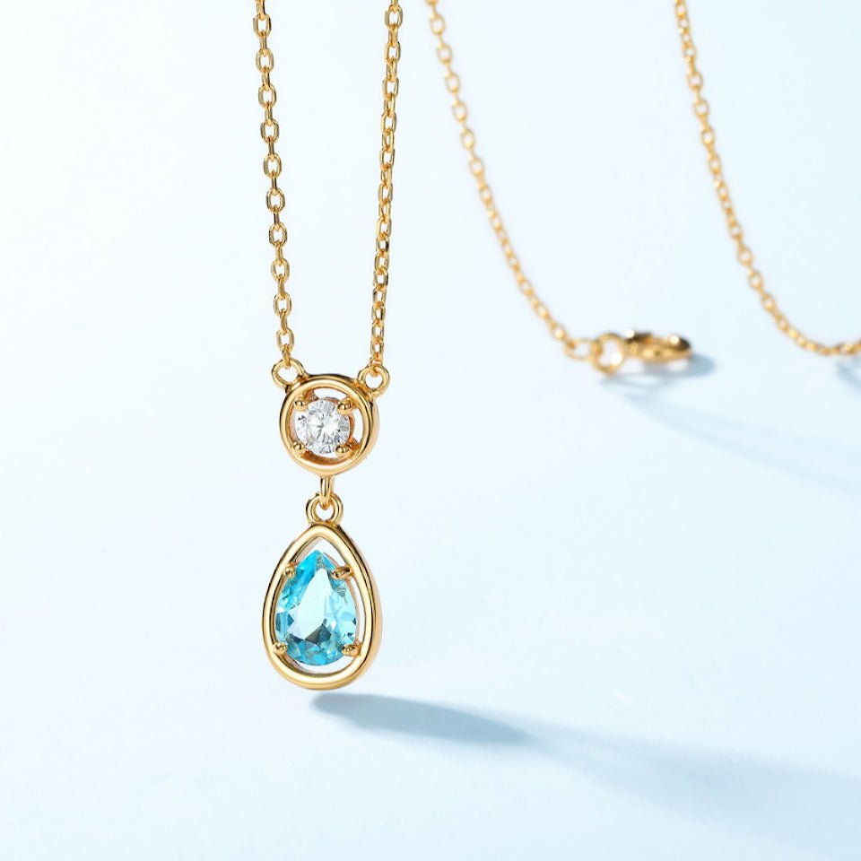 The Teardrop-Shaped Topaz Necklace is a statement of refined beauty. A resplendent teardrop topaz dangles gracefully at the center of a delicate gold chain, its deep blue hue reminiscent of the clearest ocean.