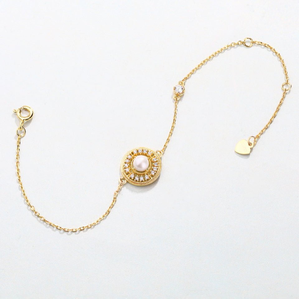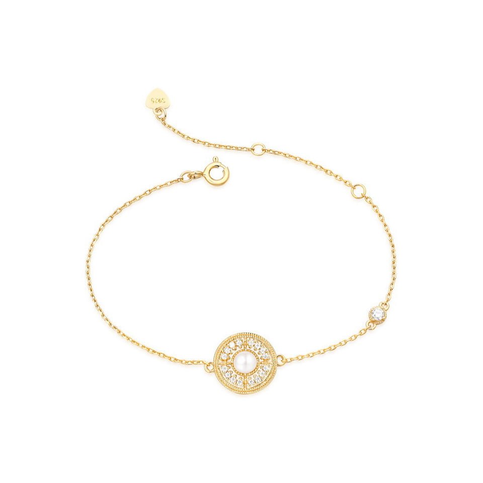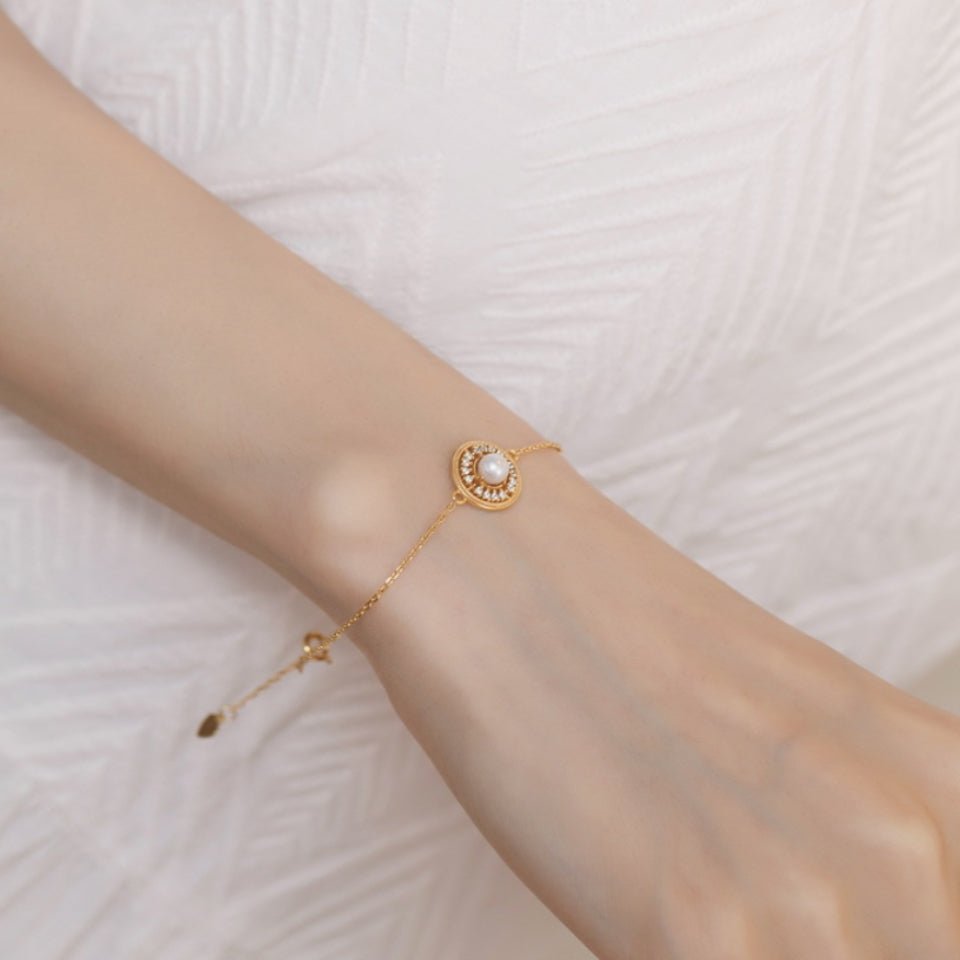Aristocratic elegance and vintage splendor merge into one, the pearl hanging between the wrists like the bright moon, seems to tell the precipitation of history and the secrets of time. Surrounded by sparkling zirconia, like stars, it reflects the nobility’s delicacy and sparkle to the fullest.